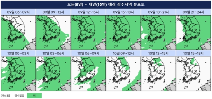 기상청에 따르면 이번 비는 9일 오전부터 시작돼 10일 낮까지 이어지며, 경기동부와 강원내륙·산지 일부 지역은 늦은 오후까지 비가 지속될 전망이다.