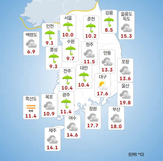 10일은 전국에 비가 내리다 오전에 대부분 그치겠고, 모레는 오후부터 밤 사이 제주도와 전남남부에 비가 시작되겠다.