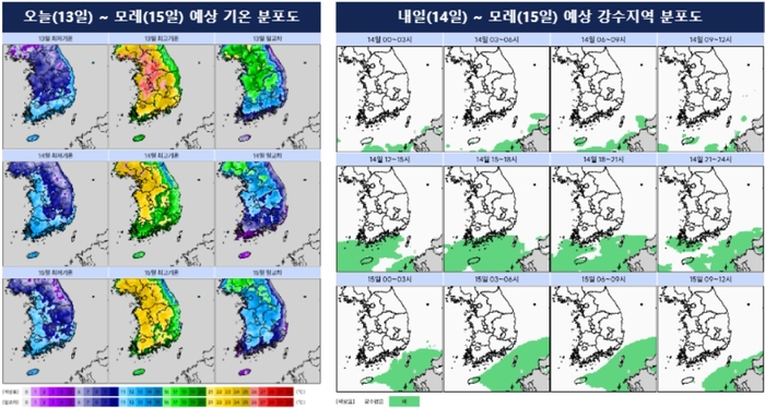 기상청에 따르면 기온은 평년(최저 3~10℃, 최고 15~20℃)보다 다소 높은 수준을 유지하겠으며, 13일 낮 최고기온은 16~26℃까지 오르겠다. 이어 14일 아침 최저기온은 7~12℃, 낮 최고기온은 14~26℃, 15일은 아침 7~13℃, 낮 13~25℃ 분포를 보이겠다.
