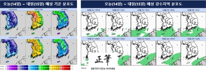 14일 낮 최고기온은 15~28℃로 전날과 비슷한 수준을 보이겠으며, 중부지방(강원영동 제외)과 전라권 내륙을 중심으로는 25℃ 이상까지 오르는 곳이 많겠다. 이후 15일은 아침 최저기온 8~13℃, 낮 최고기온 14~27℃, 16일은 아침 6~12℃, 낮 14~27℃로 비교적 포근한 날씨가 이어질 전망이다.
