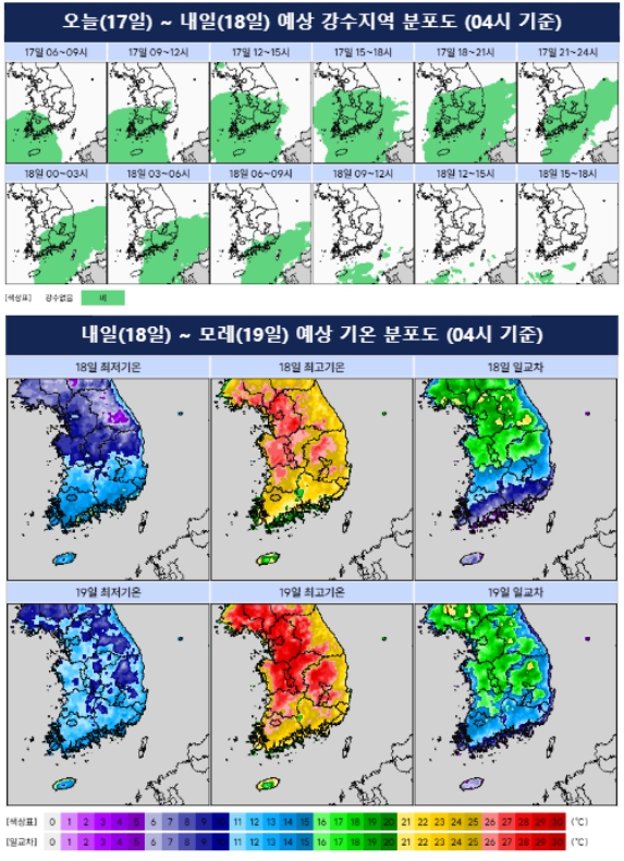 기상청에 따르면 17일 오전 제주도와 전남해안을 시작으로 남부지방과 충청권까지 비가 확대되겠다. 충청권은 이날 밤 대부분 비가 그치겠으나, 전북과 경북권은 18일 새벽까지, 전남과 경남은 아침까지 비가 이어질 것으로 보인다. 제주도는 18일 오후까지 비가 지속될 전망이다.